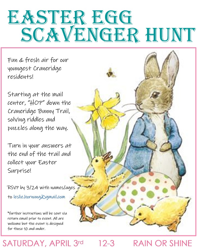 Bring the kids and join your neighbors for a fun Easter-themed Scavenger hunt throughout Craneridge!