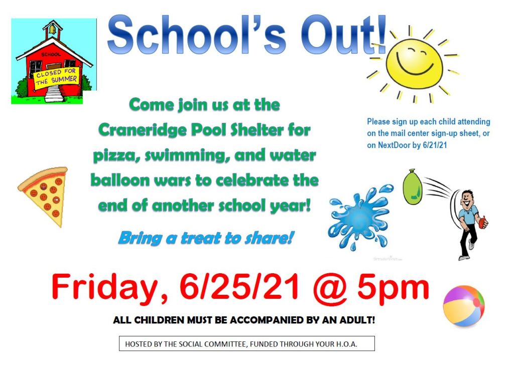 School’s Out Party! Friday, June 25th – 5:00 pm @ the Pool Shelter Posted byswichlaczJune 4, 2021Posted inUncategorized Related