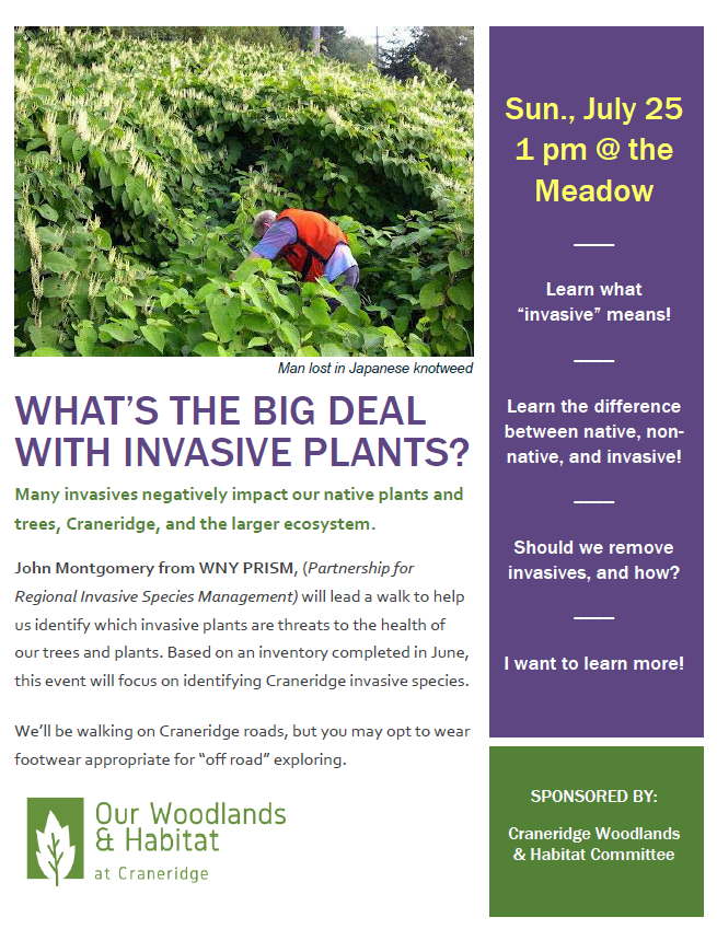 Invasive plants can take over a habitat preventing our native plants and trees from thriving. Join the Woodlands Committee on a walk with John Montgomery from WNY PRISM to learn how to identify invasives in Craneridge. Check out the details posted below! Learn more about WNY PRISM!