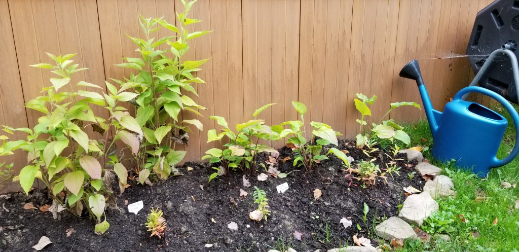 In February 2021, Gwen experimented with “winter sowing” (10 min. overview video). SURPRISE! In April and May, many of the seeds sprouted. The seedlings were then transplanted into elevated beds where they grew like crazy with this summer’s rain and heat. Seeds included two kinds of milkweed, purple coneflower, black-eyed Susan, anise hyssop, dogbane, blue-star, and shrubby St. John’s wort. Gwen also planted Shasta Daisy seeds that Amanda Bowen shared with some folks this summer.