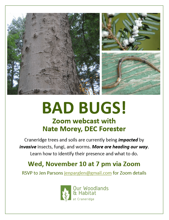 Like many trees and habitats in the northeast, Craneridge is being impacted by invasive insects and other critters that are severely damaging or wiping out entire species like Emerald Ash Borer. Our most prominent trees, Beech and Eastern Hemlock, are at risk. BONUS: An update on Asian Jumping Worms. Learn how to identify and actions to take. RSVP to Jen Parson at jenparglen@gmail.com for Zoom details.