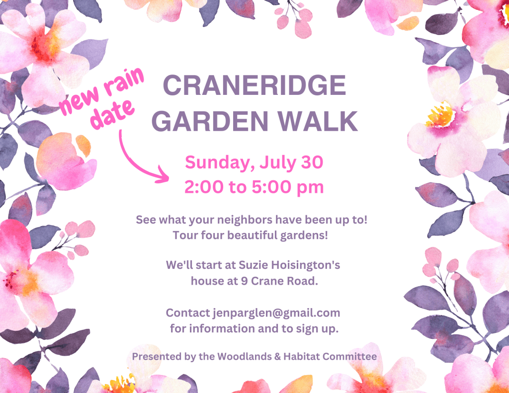 Due to rain in the forecast on Saturday, we’ve moved the event to Sunday, July 30. Meet at Suzie Hoisington’s house (9 Crane) for the first garden at 2 PM. You can register through the link below. If you’ve already signed up for Saturday and now can’t join us on Sunday, contact Jen Parsons at jenparglen@gmail.com.