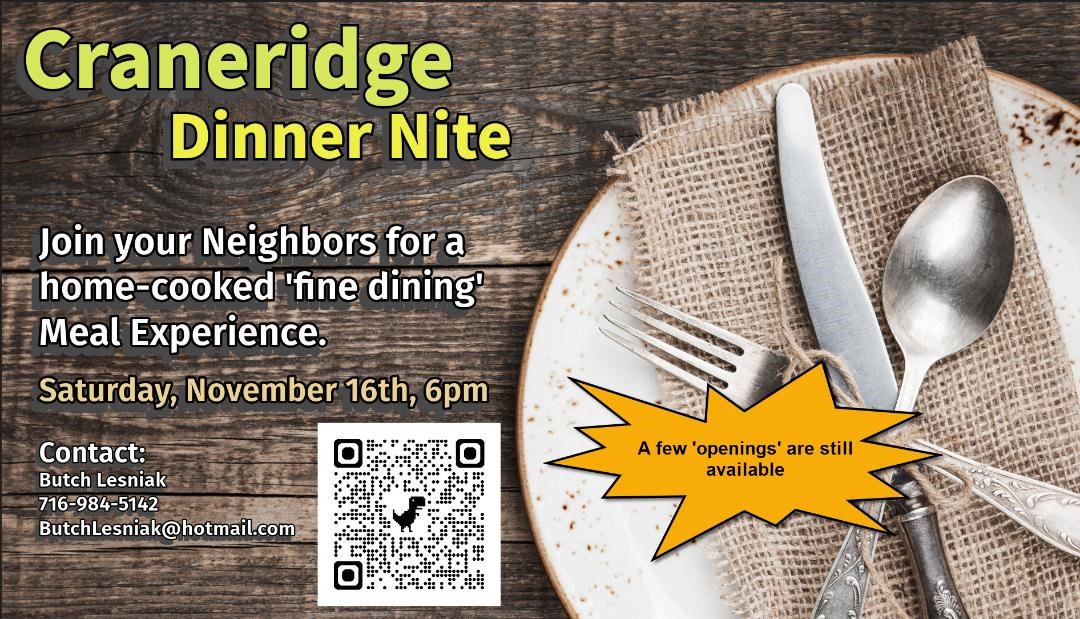 So far we have 18 people signed up for the November 16th, 6:00pm Dinner… and we are trying like to try to generate a few more participants. At this point we have 3 Host-couples… with two two-some slots unfilled in the third group. We are looking to fill those two positions… and perhaps even engender enough interest to form a fourth Group. We have opened the Event up to singles also.