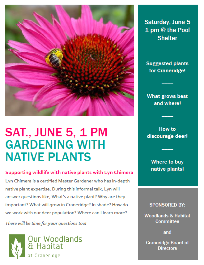 Supporting wildlife with native plants. Presented by Master Gardener, Lyn Chimera Lyn will answer… Why are native plants important? What supports pollinators and birds? What will grow best in Craneridge? What plants will deer avoid? See you at the Pool Shelter June 5! View the print version of the flyer.