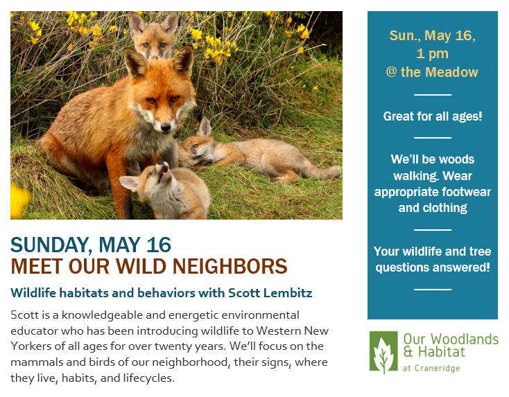 Get to know our Craneridge wildlife with Scott Lembitz Scott Lembitz is a knowledgeable and energetic environmental educator who has been introducing wildlife to Western New Yorkers of all ages for over twenty years. We’ll focus on the mammals and birds of our neighborhood, their signs, where they live, habits, and lifecycles. View the printContinue reading “Reminder! Our Wild Neighbors Walk Sunday, May 16 1:00pm @ the Meadow”