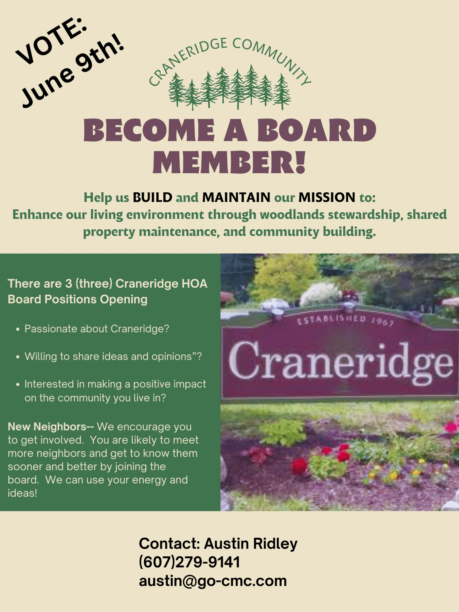 There are THREE (3) Craneridge HOA Board Positions opening, to be elected during the Annual Meeting scheduled on Sunday, June 9, 2024 If you are interested in joining the Board of Directors and getting involved in the community, please send an e-mail indicating your interest to The Nomination Committee Chair: Austin Ridley 607-279-9141| austin@go-cmc.com In order to ensure thatContinue reading “Board of Director Candidates Needed – 3 Positions opening!”