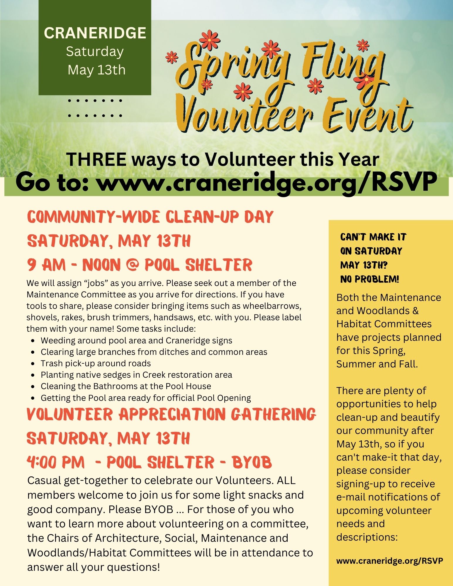 Craneridge Spring Fling Volunteer Events – starting on Saturday, May 13th
