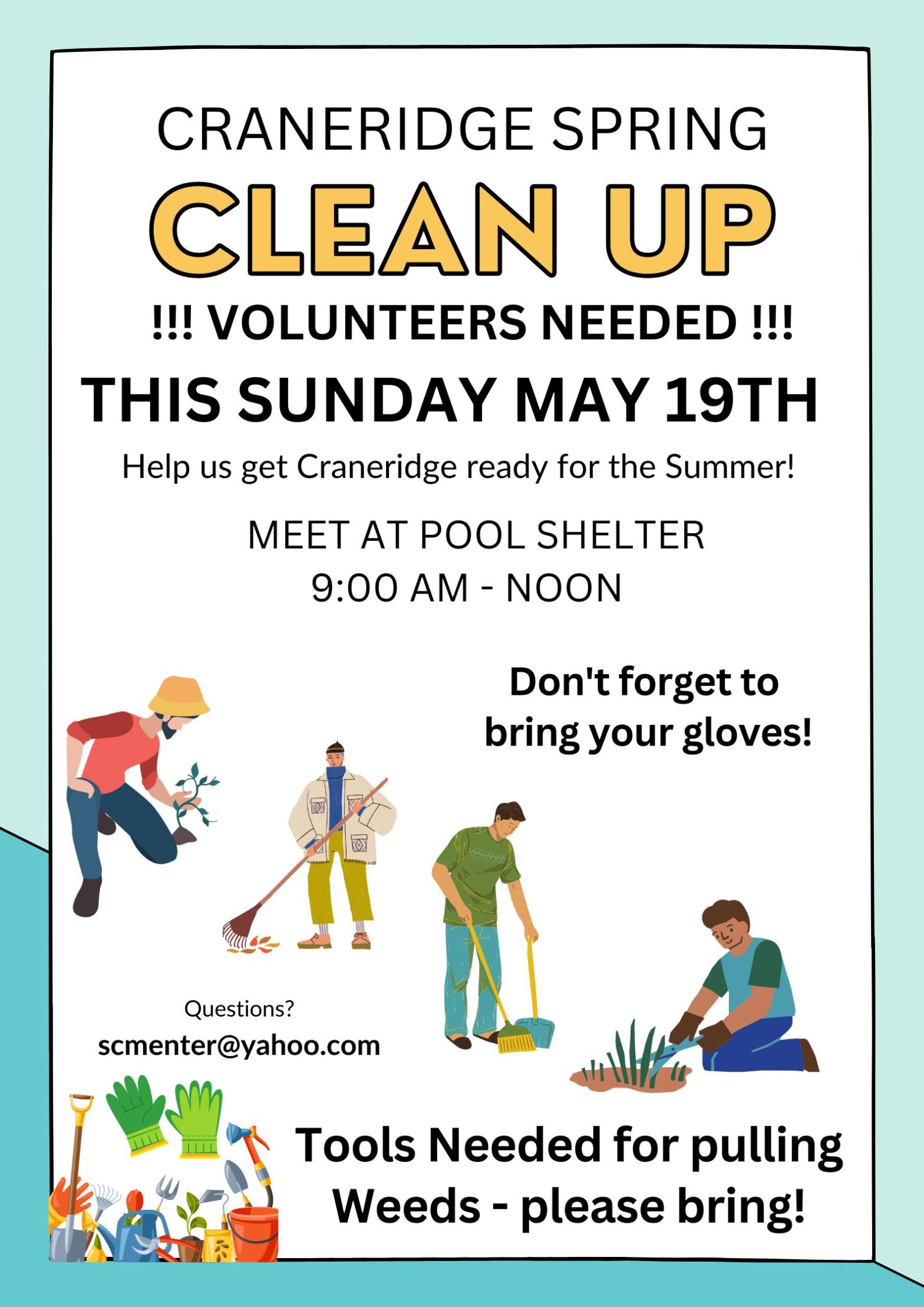 Looking for Volunteers for the Community-Wide Spring-Clean-up happening on Sunday, May 19th, from 9:00 am – 12:00 pm. Plan on Meeting at the Pool Shelter at 9:00 am this Sunday. We plan to work until Noon. Even if you can only come for an hour or will be an hour or two late, please considerContinue reading “Join your neighbors at the Craneridge Spring-Clean-up on Sunday, May 19th, from 9:00 am – 12:00 pm.”