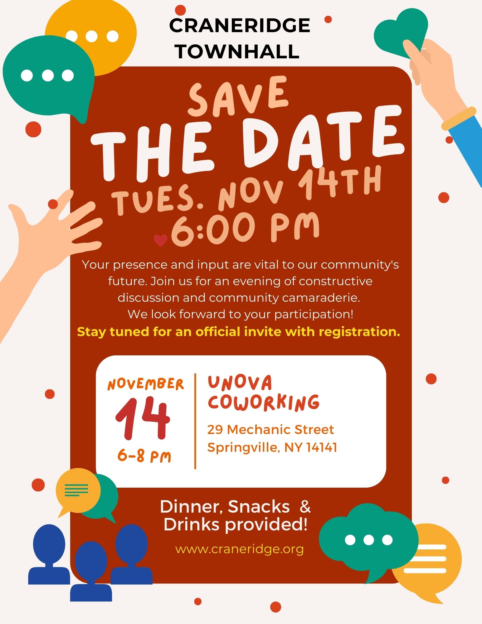 Your presence and input are vital to our community’s future. SAVE THE DATE! Tuesday, November 14th, 6:00 pm Join us for an evening of constructive discussion and community camaraderie at UNOVA Coworking space in Springville. Dinner, snacks and drinks will be provided. We look forward to your participation! Stay tuned for an official invite withContinue reading “Save-the-Date! Tuesday Nov. 14th Craneridge Town Hall”