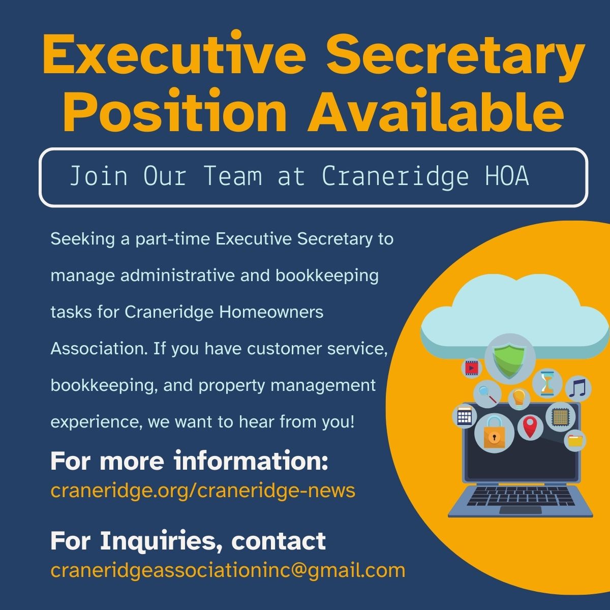 Seeking a part-time Executive Secretary to manage administrative and bookkeeping tasks for Craneridge Homeowners Association. If you have customer service, bookkeeping, and property management experience, we want to hear from you! To see the Full Job Description CLICK HERE To Apply CLICK HERE Questions? craneridgeassociationinc@gmail.com