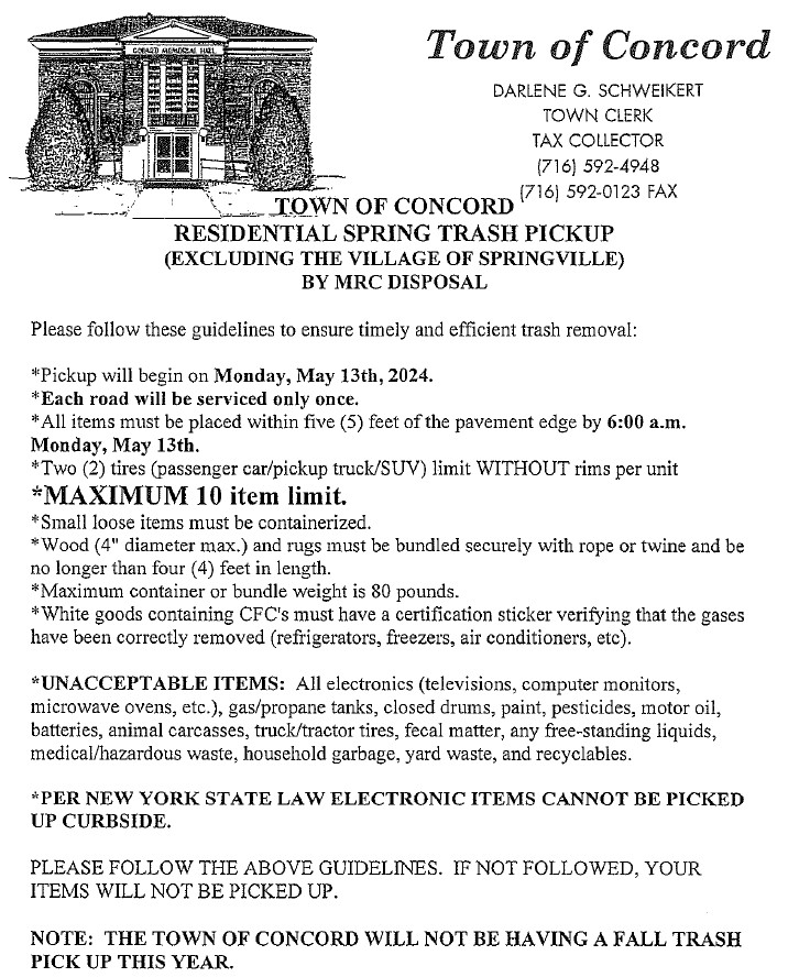Town of Concord Spring Trash Pick-up starts on Monday May 13th! Maximum of 10 items.