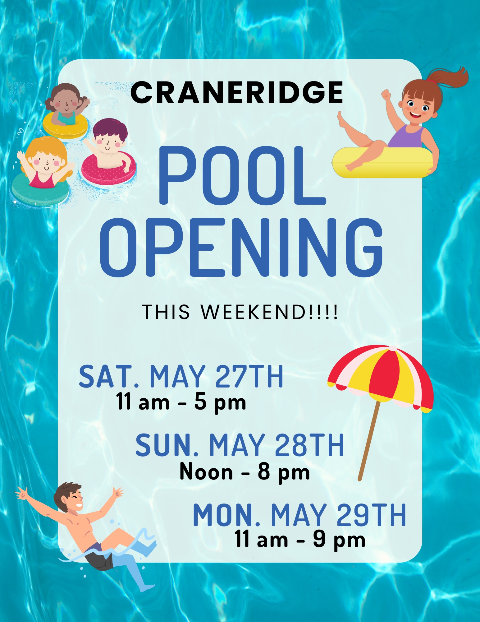 Pool Hours this weekend (Saturday 6/3 & Sunday 6/4) 11:00 am – 8:30 pm