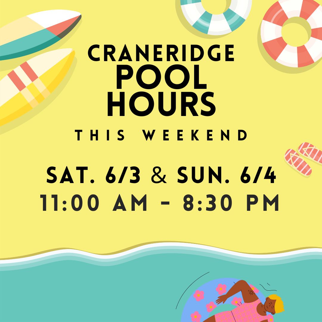 ☀️🏊♀️ CRANERIDGE POOL RULES – SUMMER 2025 🏊♂️☀️ Our pool is staffed during open hours with American Red Cross-trained lifeguards certified in CPR. The pool may close due to weather, staffing, or cleaning needs. 🔹 SIGN IN IS REQUIRED 🔹All members must sign in upon arrival. This includes: By signing in, you’re confirming that youContinue reading “CRANERIDGE POOL RULES – SUMMER 2025”