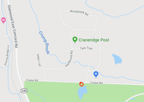Below is a Google map: the location of the hydrant maintained by the East Concord Fire Department is shown with a red circle. The hydrant is adjacent to the pond at the corner of Crane and Meadow Trail.
